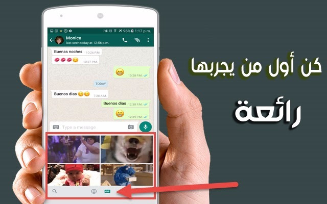 وجديد الواتساب أنها قامت بإضافة خيار جديد يسمح للمستخدمين بإرسال صور متحركة والبحث عنها أيضا على الواتساب وأنا هنا أتحدث عن هذا الخيار كما في الصورة :