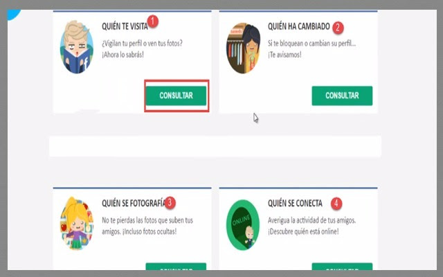 بعد الدخول إلى أي حساب إنتظر حتى يقوم بفحص الحساب ثم سيقوم بالدخول بك إلى صفحة الموقع حيث ستجد عدة خيارات ، الرقم 1 لمعرفة من زار حسابك بالوقت والتاريخ ، والرقم 2 لمعرفة من قام بمسحك أو حظرك ، والرقم 3 لمعرفة من قام برفع الصور ، ثم الرقم 4 لمعرفة وقت دخول أصدقاءك إلى الفيسبوك ، مثلا سوف أضغط على من زار حسابي على الفيسبوك وهو الخيار الأول quien te visita كما في الصورة :