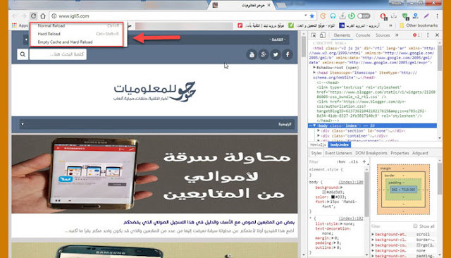 في البداية وقبل شرح الخيارات يجب علينا معرفة طريقة الوصول إلى هذه الخيارات، وضمن متصفح جوجل كروم هذا الأمر سهل وبسيط حيث فقط سيتوجب عليك أن تذهب إلى صفحة ضمن المتصفح والضغط على المفتاح F12، وبعدها ستقوم بالنقر على خيار تحديث الصفحة بزر الفأرة الأيمن وستظهر لك قائمة منسدلة تحتوي على الخيارات الخاصة بتنظيف ذاكرة التخزين المؤقت.