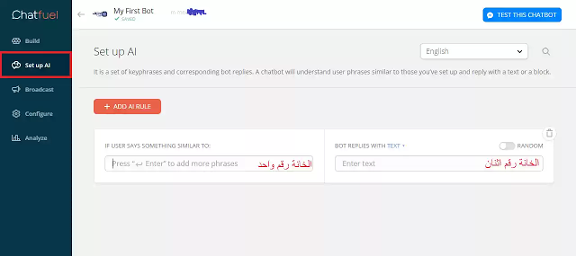 كما يمكنك تطويره أكثر للدردشة مع الاخرين ، و ذلك عبر التوجه لخانة Set up AI ، ثم سيوجهك لصفحة أخرى تقوم بكتابة الأسئلة المحتملة في الخانة الأولى ، ثم في الخانة الثانية تضع الأجوبة مرفقة برابط الموضوع في موقعك لجلب زيارات أكثر لموقعك او مدونتك ، كما يمكنك كتابة عدة أسئلة و إحتمالات في الخانة الأولى مرفقة بجواب واحد في الخانة الثانية و هكذا....