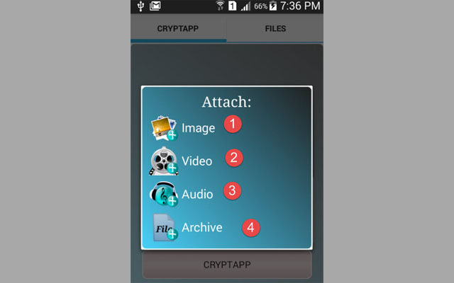 ومن ثم نختار الملف أو الصورة أو الفيديو أو أي شيء نريد تشفيره من خلال الضغط على Attached Files لكي تظهر لنا قائمة أخرى فيها أنواع الملفات التي يمكن رفعها وتشفيرها كالصور والفيديو والصوتيات والملفات والوثائق .