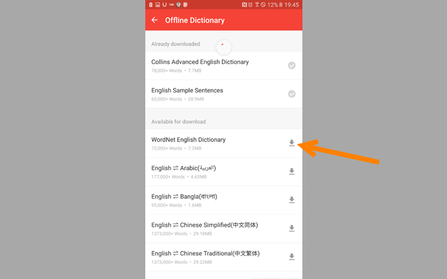 فكما تري هنا اعطاني جميع اللغات التى بإمكاني إستخدامها بدون الحاجة للإنترنت ، فكل ما عليك فعله هو تحديد اللغة التى ترغب بإستخدامها بدون إنترنت من ثم النقر على أيقونة التحميل والإنتظار إلى أن يتم الإنتهاء من عملية التحميل.
